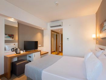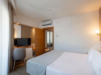 Персонал вежливый и отзывчивый. Заселили раньше, что меня очень порадовало. Потому что после дальней дороги это было просто жизненно необходимо. Мы приехали около 10 часов, заселили около 12.00. За что огромное спасибо. Так как я была с ребёнком, то мне очень понравился детский бассейн, достаточно большой и не глубокий 35 см. Было достаточно еды, прям в достатке. Вкусно и разнообразно. Детская площадка моему ребёнку тоже понравилась. Номер чистый, кровати удобные, в душе всё необходимое есть. Лучше конечно бронировать номер с балконом. При заселение и выселение помогают с багажом, если вам это нужно. Так же вызывут такси, приезжает очень быстро. До Аэропорта ехать минут 20+- стоит 30 евро. Расположение отеля тоже отличное, до моря минут 5 пешком, через дорогу. Это абсолютно не критично. Рядом есть базар, и вообще можно прогуляться. Поэтому для меня это было лучшим решением, выбрать ваш отель.