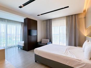 Номер 1119 - три часа музыки вечером под 120 дБ. уснуть практически нельзя - номер для глухих. В панорамном окне была щель и музыка проникала в комнату. Постельное сменили 3 раза за 10 дней (укрывное покрывало не меняли вообще), полотенца меняли редко и выборочно, туалетных принадлежностей (зуб.щетки и пасты, бритвы не давали) добавляют мало. Сантехника старая -смеситель в душевой кабинке не работал - только душевая лейка. Крепление душевой лейки разболтано, закрепил полиэтиленом на узел. Номер надо отирать и драить. Менять обои. Пляжные полотенца получаешь утром, вечером надо сдавать (нет нормального обмена). Кормят по норме (видно в целях экономии), докладывают дрожащей рукой. Еду выдают по расовой и религиозной принадлежности. Пища теплая. Препираются. Сауна была бесплатно, но надо записываться в 09:30 в день посещения, что не удобно. Пляж мелко галечный, но заход в море из крупной скользкой гальки. Без обуви не удобно. Очень много окурков между лежаками, но в этом виноваты отдыхающие и администрация. Нет отведенного места для курения. Народу много. На пляже нет социальной дистанции между лежаками. Душевая на пляже плохо работает, вода холодная. Кабинок для переодевания - всего одна да и то сразу не найдешь. В связи этим народ идет с моря кто как по отелю - в купальниках и плавках. В отеле никто не носит маски, кроме персонала (по разговору не привитый). При этом отель позиционируется как - 5* звезд.