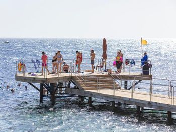 Выход к морю возможен только с пристани, нет спуска с берега. Не понятно, как плавать в море с детьми, которые не умеют плавать?