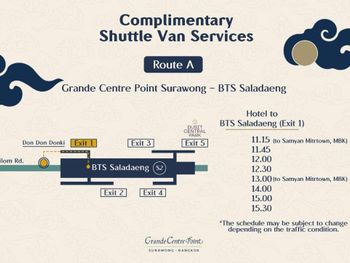 Grande Centre Point Surawong Bangkok — это отель в городе Бангкок, в 3,5 км от такой достопримечательности, как Торговый центр MBK. Среди удобств — открытый бассейн, фитнес-центр, терраса и бесплатная частная парковка. One Bangkok — примерно в 3,6 км, а Дом-музей Джима Томпсона и Торговый центр Gaysorn Village — в 3,9 км и 4,2 км соответственно. Гости могут обратиться к сотрудникам круглосуточной стойки регистрации, воспользоваться трансфером от/до аэропорта или доставкой еды и напитков, а также подключиться к бесплатному Wi-Fi.