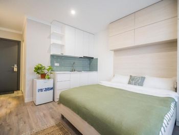 One Bedroom Apartement - 40-45 м², вид на море/горы | гостиная с мини-кухней и диваном, спальня (двуспальная кровать), ванная комната