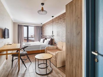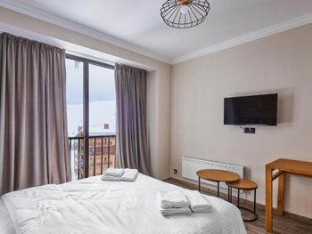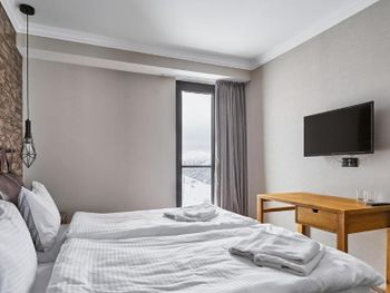 Отель новый, но в номере (на первом этаже) кровать сразу у балкона и от него так сильно дуло, что штора всю ночь веяла туда сюда. Было холодно спать, даже в свитере...как в холодильнике. Батарея была закрыта на 90% диваном, что по идее не логично...и это давало свой эффект, почему в комнате было холодно. Просто диван или батарея не там где надо. Зато комната была очень чистая и на ресепшне были все очень вежливые, но помочь не могли! Тапочки для сауны (в номере) все одинаковые, на ногу 37 розмера. Больше размеров не было. У меня нога 45, что для мужчины нормально. Что делать? ...В бассейне было очень скользко, так как пол не бытирали много часов...но вид и состояние сглаживали этот факт, так как вид - это просто сказка. За это даю отелю все 10! За то что ночью замёрз даю 1 бал! Только нормальная изоляции и проверка и отель будет один из лучших! Спасибо