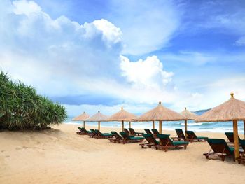 на пляже зонтики, шезлонги: бесплатно
