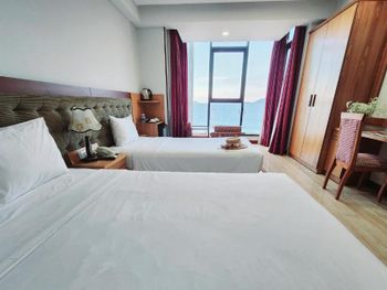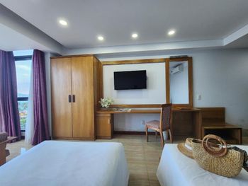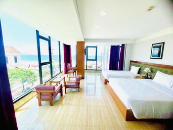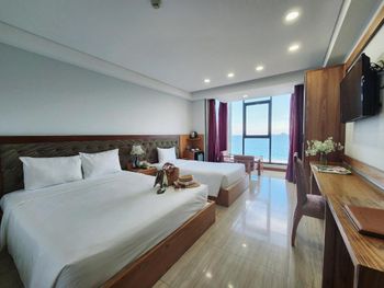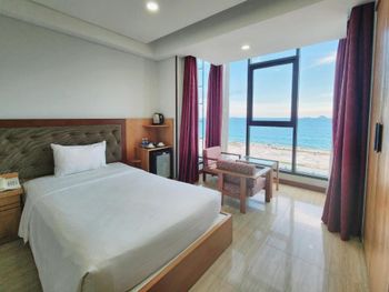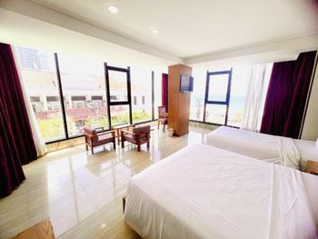 Бронировали представительский люкс с видом на море за месяц!!!По приезду дали нам боковой номер,категория которого должна звучать как «с частичным»видом на море. На ресепшн номер менять отказались,соврав о том,что свободных с видом на море нет(зачем бронировал за месяц,спрашивается?) да и вообще,если вам посчастливиться встретить кого-то на ресепшн,помощи не ждите,абсолютная не заинтересованность персонала,даже нож не стали искать по нашей просьбе,что абсурд для отеля. В лифте жутко воняет помоями,бассейн покрыт грязевой пленкой,страшно было даже окунуться туда, про завтраки-отдельная тема. Из 6 дней мы приходили туда 3 раза и ровно столько же раз разворачивались и уходили,есть было нечего,от слова совсем. Для вьетнама это просто позорище. Кроме расположения,уборки номеров и того факта,что нас заселили в 12 дня плюсов больше нет,хотелось поскорее съехать отсюда. За эти 3 плюса-оценка 3 звезды.