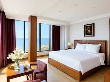 Бронировали представительский люкс с видом на море за месяц!!!По приезду дали нам боковой номер,категория которого должна звучать как «с частичным»видом на море. На ресепшн номер менять отказались,соврав о том,что свободных с видом на море нет(зачем бронировал за месяц,спрашивается?) да и вообще,если вам посчастливиться встретить кого-то на ресепшн,помощи не ждите,абсолютная не заинтересованность персонала,даже нож не стали искать по нашей просьбе,что абсурд для отеля. В лифте жутко воняет помоями,бассейн покрыт грязевой пленкой,страшно было даже окунуться туда, про завтраки-отдельная тема. Из 6 дней мы приходили туда 3 раза и ровно столько же раз разворачивались и уходили,есть было нечего,от слова совсем. Для вьетнама это просто позорище. Кроме расположения,уборки номеров и того факта,что нас заселили в 12 дня плюсов больше нет,хотелось поскорее съехать отсюда. За эти 3 плюса-оценка 3 звезды.