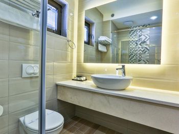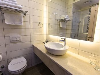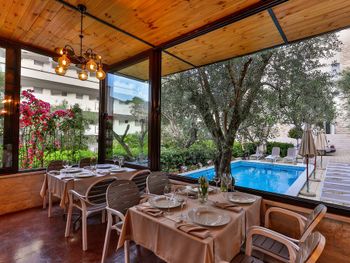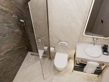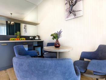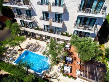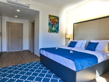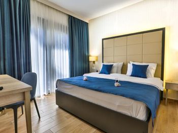 В целом если не тянет на свои деньги. Если уж ничего хорошего не нашли, то можно тут остановиться. Территории у отеля почти нет, если не считать 2 квадрата у бассейна. Номера очень маленькие. Мы бронировали люкс с балконом, был заявлен как 42кв. Приехали , заселяемся, заходим в номер даже коридора нет, сразу начинается комната , вся обувь располагается посередине комнаты, если разложить диван маленький, то уже не пройти к балкону. Балкон очень маленький. Спальня очень маленькая , проход у кровати только боком. Шкаф сделан один на весь номер, в нем только нижняя полка и очень высоко весит штанга, вещи доставал только муж, с ростом 168 достать можно только привстав на полку. Самое основное, Кондиционер! Есть только в гостевой комнате, в спальне нет, духота в 34 градуса, спать нереально. Делали кондиционер на 19 градусов на целый день и уходили из номера чтобы комната остыла и хватило на пол ночи. Завтраки однообразные. Кофе как из пакета (не кофемашина). Ванная комната из душа вытекает вода в ванну, выходишь в лужу. Нет ни одной полки чтобы поставить средства по уходу, есть только столешница на которой стоит очень большая раковина, из за которой ничего больше не поставить ? При проживании 4 человек средства ставят только на одного, 3 остальным мыться не надо?... постоянно приходилось говорить уборщицам поставить средства чтобы помыться.