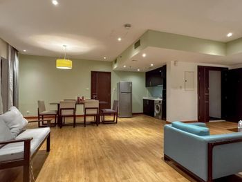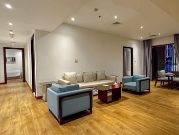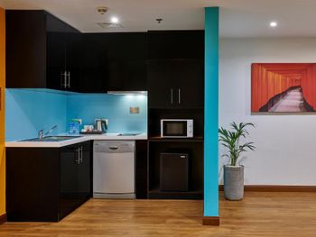 Брали апартаменты с одной спальней, комната просторная, но балконов нет. Кровати жёсткие, не было в наличии перьевых подушек, дверь в душевой кабине не закрывалась до конца и вода выливалась на пол. Вода плохо регулировалась, то кипяток, то холодная. Холодильника по факту нет, такой же как во всех отелях, маленький под мини бар. Зато стоит посудомоечная машина, которая не особо нужна при наличии нескольких тарелок и приборов, лучше бы поставили стиральную машину. Балкона не было, вещи в ванне сохли очень долго.