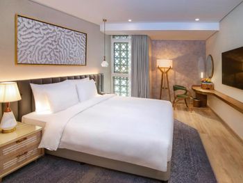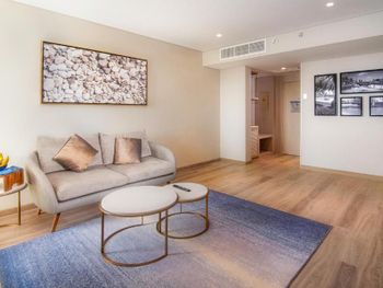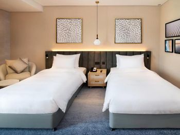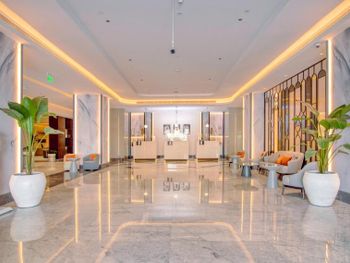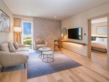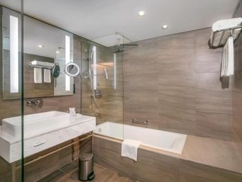 Из-за праздника и выходных при заселении было очень многолюдно в фае. Долго прождали в очереди на ресепшен. Заплатили наличными в долларах, взяли на 30 долларов больше, чем было указано в букинге. Поэтому советую обменять деньги и потом ехать в отель. Лучше бы мы обменяли валюту в аэропорту. Брали два номера, нас было четверо, родители и двое детей (17-15 мальчик и девочка). Дали номера не рядом а через одну комнату. В обоих номерах оказалось только одна кровать размера кинг сайз. Поменять один номер на двух местное для детей с двумя кроватями, как мы изначально бронировали не получилось. Предложили на другом этаже, но мы отказались. Хотели чтобы дети были рядом. На пляж не получиться пойти в купальнике, так как нужно через проезжую часть проходить. Об этом мы изначально знали, но не знали, что нам не захочется искупаться на их плаже. Вход в воду каменистое, вода какая та мутная. А лежаки около пляжа очень гразные, мы даже на них не сели. Может когда они были белого цвета, сейчас очень потемнели под дождём видимо долго пролежали. У бассейна было очень многолюдно из-за праздника и выходных, с детьми не захотели туда идти, так как все рядом курили кольян. Бронировали из-за канатной дороги и прыжков зип лайн, но туда тоже мои дети не смогли попасть. На качели тоже не смогли покататься, было постоянно занято. Очередь и уйма народу было. Так что друзья не букуйте жтот отель на праздники и выходные. Это центр города и пляж для всех, такое ощущение было. Дети после того как искупались очень долго добирались до номера в мокрой одежде, везде кондиционеры, очень холодно. В комнатах нет балкона, выд через маленькое окно, которое не открывается. Купальник не высушился до утра в номере. В столовой было очень многолюдно и шумно. Заплатили за сутки 468 долларов. Отель на 5 звёзд не тянет. Номер очень маленький. Зубных щеток нет.