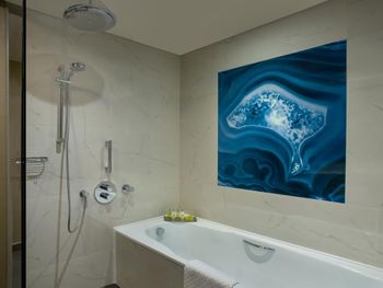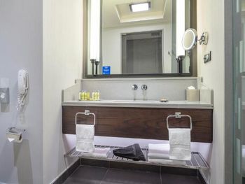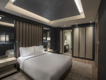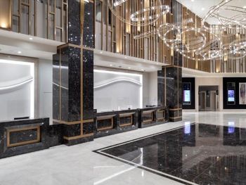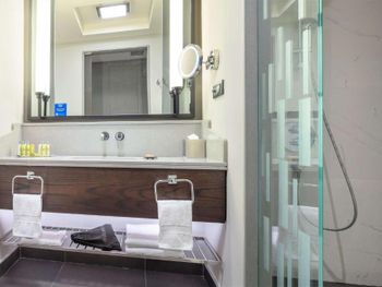 при заезде в номер ощущался запах табачного дыма, и пришлось проветривать помещение. Несмотря на заявленные условия, в номере не оказалось халатов, и к тому же, при заезде нас не ознакомили с особенностями номера. Отель позиционируется как 5-звездочный, но внутренняя отделка не соответствует этому уровню — мебель потертая и старая, стены в ванной были грязными, а температура воды в душе постоянно менялась-постоянно резко становилось горячо. Также при заезде обнаружили грязное одеяло, которое пришлось заменить. Ресторан оказался чрезмерно дорогим, даже по сравнению с самыми дорогими ресторанами.