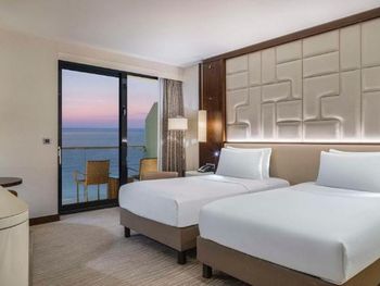 Отель расположен на первой линии у самого моря. Просторный номер, с балконом. Есть и ванна и душевая. Безупречно чисто! Полотенца меняют ежедневно. Качественная мебель и бесподобно уютная кровать, в которой проваливаешься в сон, сам того не замечая. Отдельное спасибо за отличный климат-контроль, почти бесшумно и деликатно прддерживающий заданную температуру в номере. Очень богатый выбор продуктов на завтрак, где было все, кроме икры и шампанского. Хотя отсутствие икры и игристых вин на завтраке нужно отнести к минусам для отеля в 5 звезд... :)