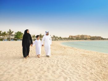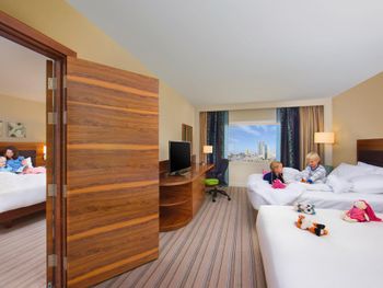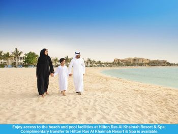 Кровати в номере Queen две большие 130-140 см, семья на 4 с детьми нормально поместится, трансфер и посещение пляжа отеля Хилтон резорт через Booking платный,15 дирхам с человека. Там просто рай) оч красивое место... но дорогое))) на территории кофе 22дирхам, мороженое 20 дирхам, цезарь 35 дирхам