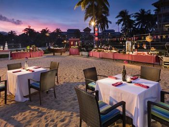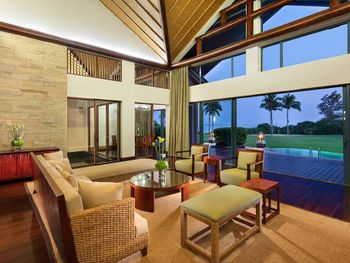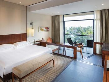 Отель замечательный, в колониальном стиле. Отлично расположен, замечательная зеленая территория с множеством бассейнов и тропической зелени. Отель в ней просто утопает. Этого нет в соседних отелях. Отличное место для отдыха с детьми. Есть номера на первом этаже, из которых с балкона можно выплыть прямо в бассейн. Отличный песчаный пляж. на территории масса мест, где можно смыть песок и морскую воду. В отеле 8 корпусов, которые расположены полукругом от основного корпуса и имеют переходы между собой и выходы на территорию. За корпусами с 1 по 4 шикарный тропический парк с прудом, на котором живут черные лебеди и масса уютных беседок. Завтраки отличные. Ужинами один раз в отеле. Шведский стол, Ходили вечерами в разные места. В соседнем Марриотте отличный японский ресторан. Дошли влево по пляжу, это соседний отель. А из центрального входа в Марриотте можно выйти к торговому комплексу, где в подвальном помещении магазин, а на втором этаже шикарный винный и несколько ресторанов. Нам очень понравилось в том, где стены зеленого цвета в клубном стиле. Все понятно, вкусно и недорого. Перед магазином хорошая фруктовая лавка. До Нашего отеля можно дойти по улице влево за 10 минут. Напротив Марриотта гольфный клуб. Там тоже есть ресторан. Номер "Премиум" с двумя отдельными кроватями. Большой, в двух уровнях. 58 кв.м. Номер в колониальном стиле. Если кто-то был в Индии в дорогих отелях, тот поймет (двигающиеся резные перегородки, кафельный пол). Спальная зона отделена от чайной ступеньками и невысокой перегородкой. Есть круглый стол, диван и кресло. Много разнообразных светильников. Чайные принадлежности, холодильник. Уютный балкон, шикарный вид. Цена вполне соответствует качеству. При выборе отеля из четырех рядом стоящих выбрали Хилтон по отзывам и не прогадали.
