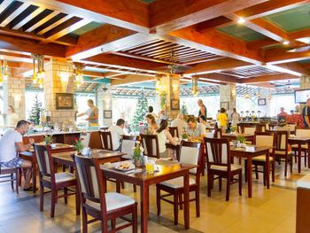 Плюсы: Очень симпатичная территория, много деревьев, есть бассейн, в номере хорошая большая кровать, отличные завтраки, зонтик и шлепанцы в отеле, отличная ванная комната, хорошее новогоднее шоу и ужин, красиво украшена территория на НГ, дискотека до 2 или 3 ночи. Кушали в обед в кафе Арарат.