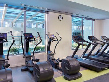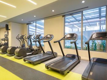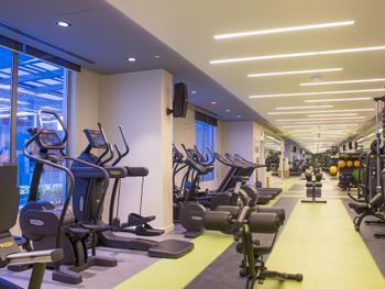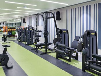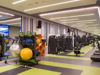 Поддерживать физическую форму можно в современном тренажерном зале с душем и запирающимися шкафчиками.