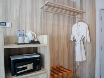 Мы очень много путешествуем по Таиланду и всегда останавливаемся только в отелях 5 *. Но в этот раз, когда мы приехали на Краби на эти 2 дня отелей 5* свободных не было ☹️. А заранее мы не бронировали. Пришлось выбирать из 4* по отзывам. В этом отеле понравилась территория. Есть большой бассейн, лежаки, Всё как-то внутри отеля и получается, что дороги, которая совсем рядом и не слышно совсем - это +. Номера по размеру в принципе нормальные для 4 *. Кровать, диванчик, столик, тумбочка, вешалки. Всё норм.