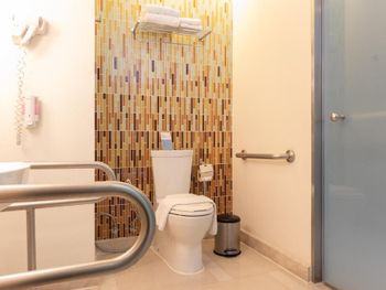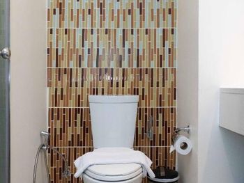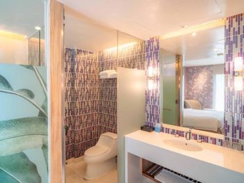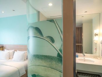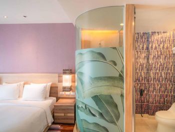 2. Огромный минус- это туалет в номере , как видно на фото это просто зона огороженная стеклом. И это ужас как неудобно. Ходишь сходить в туалет, все слышно в комнате . Если вы девушка и с парнем , то это не очень , ходить в туалет со всеми звуками.