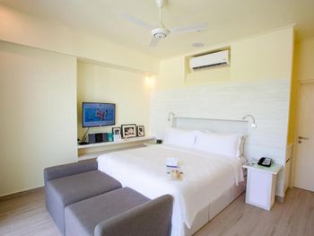Пляж! Он испортил все впечатление. Для долгого пребывания данный объект нам не подходит. Пляж не должен располагаться в месте,где приплывают корабли. Вода грязная,плавают нечистоты(((. Больше на острове пляжа хорошего нет. Лагуна,мелкая,для деток и пляж,где плавают серферов,но там камни. Есть небольшой кусок по береговой линии,но дно коралловое и много травы в воде. Хотели остаться ещё на одни сутки,но к сожалению,эти же номера стали дороже на 350 долларов((