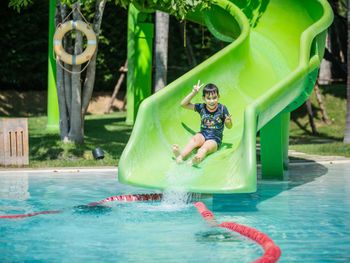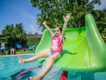 Бассейн теплый, для детей огромный плюс. Горки для детей старые.