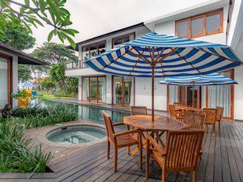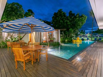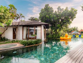 Вкусные завтраки, красивый бассейн с баскетбольным кольцом, можно кататься на велосипедах, близко к Куте.