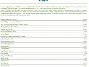Отель находится в 500 метрах от популярного торгового центра Cevahir. В 2 км от отеля Holiday Inn Sisli расположен Выставочный и конгресс-центр Стамбула. Прогулка до остановки скоростного автобуса Metrobus и станции метро Sisli, откуда удобно добираться до других районов города, занимает несколько минут. Расстояние до Международного аэропорта Стамбул составляет 35 км.