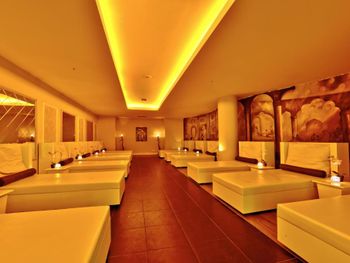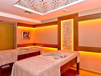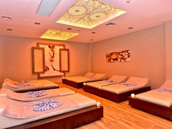 Зонтики на пляже полупрозрачные, с тенью не очень. Плюс очень низкие, постоянно головой бились. В СПА нет места для переодевания.