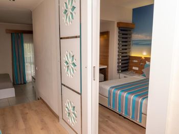 Заезд был в 14-00, заселили сразу. Повысили категорию номера. Море чистое, еда вкусная, бассейны свободные, лежаков всегда достаточно. До 24-00 дискотека, долбит музыка. До торговых рядов пешком минут 25.