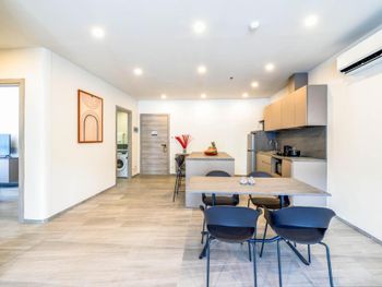 Бассейн на крыше, чистота, очень зелено, спортзал, игры, уборка апартаментов отличная, можно с животными, хорошая парковка, место для коворкинга, рядом есть магазины, массажи, прачечная, кафе, рынок с фруктами.