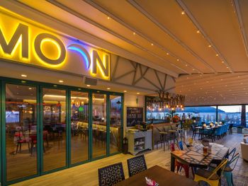 Гости могут поиграть в бильярд рядом с баром под открытым небом, где подают напитки и коктейли. Из открытого лаунджа и ресторана отеля Honeymoon видны море и горы.