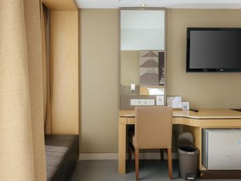 Номера, как и весь отель немного подуставшие. Вид из окна на стену соседнего отеля + слышно шум системы кондиционирования.