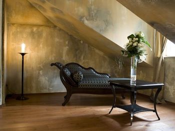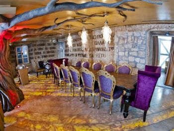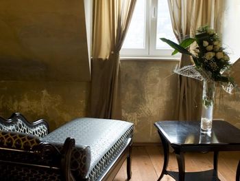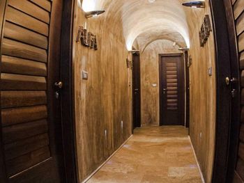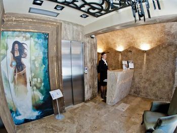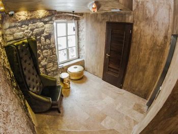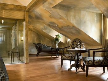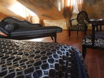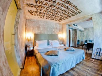 Лифт не работал — но это не недостаток (если не облом ходить по ступенькам). Вид из окон на крепостную стену — тоже класс. Учитывая, что она выше окон и по ней временами ходят туристы. Дизайн нашего номера больше подходил для Хеллоуина.