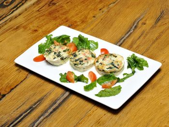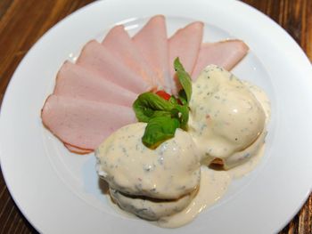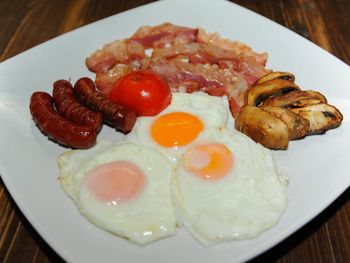 Пол липкий. Завтрак из двух блюд. Еды на тарелке много, но не особо съедобно — на голодного любителя пересушенного бекона и майонеза.