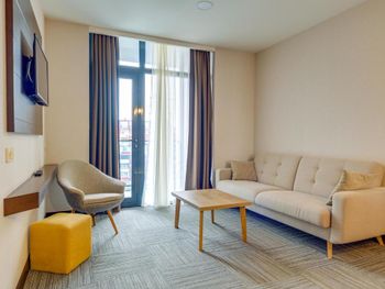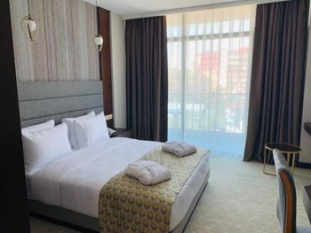 Отель встретил нас очень радушно, Давид и Нина оформили нас, всё рассказали и потом помогали нам с нашими вопросами и карту нам дали, отметили там, всё что нам нужно было... Отель чистый, аккуратный, очень приятно там жить. Расположение супер! Всё в доступности, вышел на право набережная, прямо перед тобой кофейни, фруктовые лавки, слева сразу вкусный ресторанчик... В холле кресла, диванчики,удобно, можно посидеть,отдохнуть. У нас был 7-ой этаж. В номере-постели удобные, у нас были две кровати, на балконе столик и два кресла, очень приятно выйти посидеть. В комнате есть всё необходимое, чайный уголок, тапочки и халаты. Есть кондиционер. В ванной комнате кобинка, всё было хорошо, всё исправно, туалет с биде. Комфортно,чисто. Бассейн на первом этаже, очень понравился, большой, вода приятная, мы попадали так, что наслаждались плаванием одни... В столовой очень хорошо, правда нет черного кофе. Есть в баночке сухой кофе. В чайнике кипяток и другой краник-это крепкая заварка. Все наливали, пробовали, сначала не могли понять... Просто все ожидали налить готовый кофе... Завтрак вполне хороший, голодным не уйдёшь и вкусно, яичница и яйца варёные, два вида сосисок, пастрамы, колбасы и сыры, зелень, овощи и салатик, фрукты, сладости, корнфлекс, молоко, супы молочные и был куринный-вкусные. Хлеб, булочки, пирог с начинкой типо пиццы. Картофель и вермишель. Всего достаточно. Отель тихий, что очень приятно. Горничные всегда стучатся и спрашивают разрешения зайти прибраться... Мы остались ещё на один день, отменили рейс и мы легко доплатили на стойке регистрации ещё за один день, оставшись в том же номере. Спасибо большое. Спасибо большое за хороший отдых!