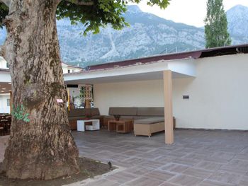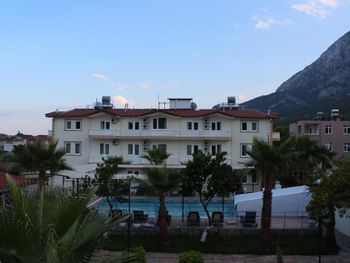 Вид на горы, недалеко от пляжа. Близко общественный транспорт.Внимательный персонал, простая турецкая кухня. Кофе, чай, вино, вкусные лепешки - гюзлеме.