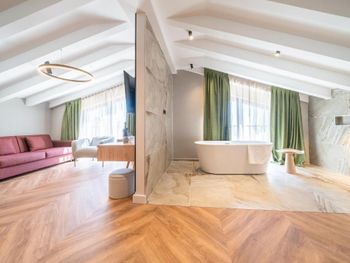 Достаточно большая комната, возможность пользоваться джакузи на крыше по предварительному заказу, удобная кровать, халаты
