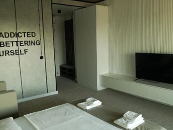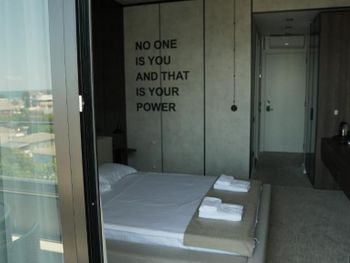 Неожиданно стильный отель. Подобных я в Кобулети вообще не видел. Явно привлекали хорошего дизайнера. До моря три минуты пешком, рядом есть супермаркеты. Интересная фишка: перед отелем висит экран и туда проецируется изображения с ютуба. Можно ставить клипы, футбол и т.д. Классное решение. Номер с кондиционером, свежий, чистый, светлый, просторный. Персонал вежливый: все вопросы быстро решаются. Можно воспользоваться стиральной машиной за отдельную небольшую плату. С WiFi проблем не было. Завтраки включённые - шведский стол. Голодным не уйдёшь: нарезки, сыр, яичница, маслины, овощи, творог, фрукты и т.д. Цены на бар вполне демократичные. Приятная территория перед отелем: бассейн, большие зонты, столики, лежаки, площадка с травой для игры. Есть где припарковать авто. Всё очень на уровне. Фото с букинга соответствуют 100%.