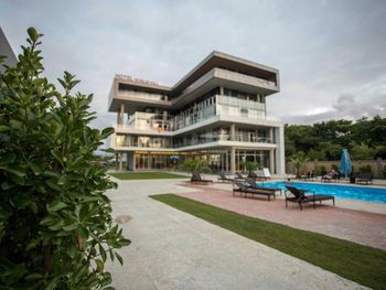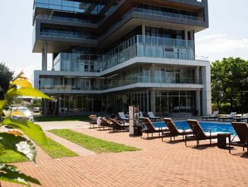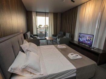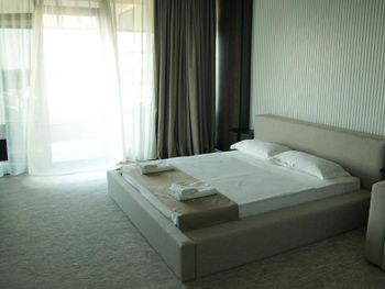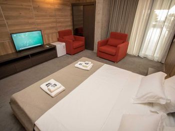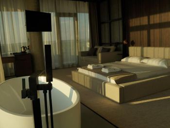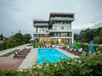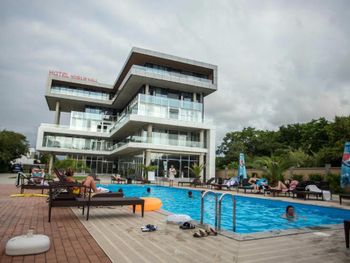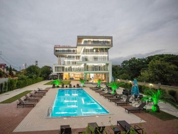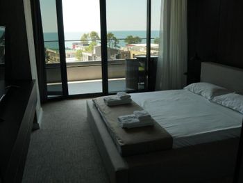 Очень красивый, современный стиль постройки отеля. Качественный ремонт в европейском стиле. Лифт. В каждом номере кондиционер. Удобная спальная мебель. Телевизор. Холодильник. Завтраки свеже приготовленные, вкусные, по времени очень удобно. Разнообразное меню на обед и на ужин. Пища в отеле готовится поварами очень вкусная. Продукты качественные и свежие. Санитарное состояние кухни, номеров отличное, белоснежное бельё. Расположение отеля - 150 метров до моря. Пляж большой, чистый, мелкая галька. Большая территория отеля. Бассейн. Очень добрый и доброжелательный обслуживающий персонал отеля.