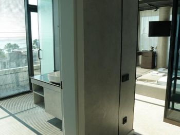 Мало шкафов и полок, один маленький незакрывающийся шкаф на троих на 2 недели это мало. В ванной нет ни одной полки, только маленькая под зеркалом.