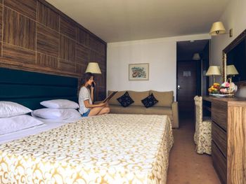 Номер: старая разваливающаяся мебель, система кондиционирования старая, температура в номере не ниже 28 градусов, ванная комната старая, грязная, не работают сливы, после первого посещения душа затопили номер. Менеджмент: на все мои жалобы дежурная улыбка и ответ: на температуру 28 градусов в номере - на улице жарко, поэтому и в отеле жарко, на затопление - пришел сантехник, при мне открыл решетку, вытащил кучу волос и ушел,просила убрать номер после потопа - никто не пришел - номер убирала сама. По мнению администрации у меня был один из лучших номеров отеля!!! Пляж -его нет, развалившиеся лежаки на траве у отеля. Спросила где можно взять пляжные полотенца - мне порекомендовали купить их в соседнем магазине за 5 евро!