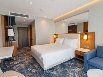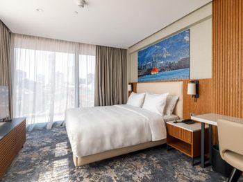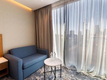 Просто отличное расположение, на мой взгляд намного лучше, чем если бы мы заселились в высотках, но возможно это из-за сезона (были в этом отеле перед нг). Все, что нужно, в пешей доступности. Персонал очень вежливый, заселялись около 22:00. Сам номер красивый, уютный, чистый. Вся мебель и санузел новые, приятный запах у шампуня/геля, горячая вода и кондиционер работали исправно. После уборки оставили новую воду. Помимо кровати еще были удобный стул и диванчик. Много разных источников света. Однозначно заселились бы сюда снова.