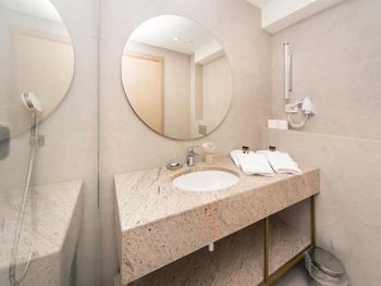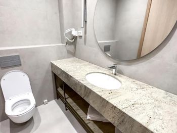 В номере есть чайник, однако из-за запаха пластика вы вряд ли сможете пить эту воду после кипячения. Кстати, куллера с водой тоже нет, вам придётся покупать её самостоятельно. Вода в душе перестала сходить после второго использования. Вежливо попросили персонал помочь, в ответ получили: «Сами виноваты, не надо было ставить "Не беспокоить"».