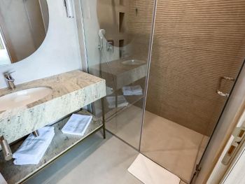 В номере не хватало многих мелочей, крючков для полотенца, мусорного ведра, вытяжки в ванной и из душевой постоянно вытекала вода