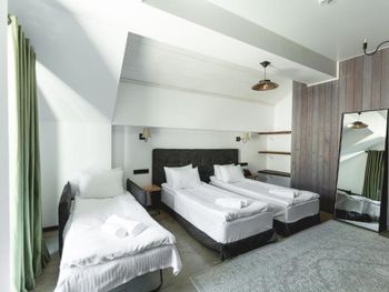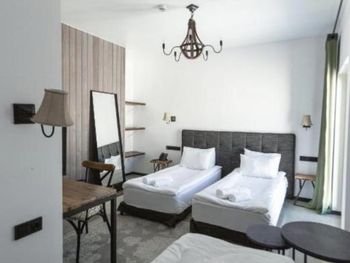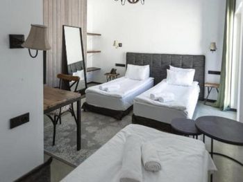 В трехместном номере не разойтись 2 людям. Номер очень неудобный. Номер был с балконом, если его можно так назвать))) Балкон примерно 30см, поэтому кофе и чай там попить не получится! Вся мебель и отделка в номере очень простенькие. Стены окрашены в белый цвет и все в потертостях, что неприятно. Одна розетка была в чем-то липком. В номере разбит откос от дверной ручки, так как не установили стопор на дверь. Вокруг двери вся штукатурка осыпалась. В ванной держатель лейки просто не закреплен (видимо сложно подтянуть 1 винт). Всё говорит о том, что никто не следит за номерным фондом. Пол - просто бетон, понять визуально чистый он или нет не представляется возможным, соответственно, ни о каком уюте в номере не говорится. Ощущение, что спишь в коридоре! Завтрак очень скромный, по вкусу очень прост! Спасибо, что омлет с сыром приготовили (но его нужно отдельно просить, никто этого не предлагал). Работал один джакузи и тот который внутри здания, без красивого вида на горы.