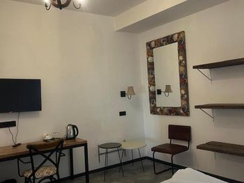 отличный отель! на территории бассейн с подогревом и джакузи в здании с гидромассажем. вкусный завтрак, красивая веранда с шикарным видом на церковь и горы. такой же прекрасный вид открывался из номера. персонаж очень вежливый, помогли решить вопрос с трансфером до Тбилиси, а также продлили время check out. говорят на английском и одну девушку на русском. все понравилось)