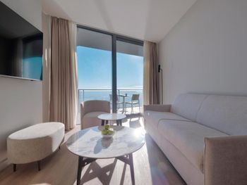 Наш номер с террасой на 10 этаже выходил на набережную и променад, где до часу ночи громыхала музыка, не спасали ситуацию закрытые двери на террасу. Очень разочаровала ситуация с пополнением в номере воды и чайных принадлежностей: в пятизвездочном отеле в день заезда предлагается одна бутылка воды (приветственная), в остальные дни она платная! В номере стоит кофемашина, но пользоваться ею можно только за отдельную плату! Для пяти звезд и достаточно высокой цены за проживание такая политика в обслуживании клиентов совершенно не оправдана!