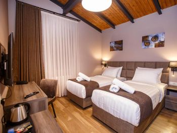Отель находится выше курорта , поэтому открывается невероятный вид на горы. Комнаты чистые , видно что отель молодой , все свежее . Завтраки вкусные , кухня очень вкусная ! Можно в любое время заказать покушать. Отдельное спасибо хочется сказать персоналу ! Все супер отзывчивые , было ощущение , что находишься дома . Есть классная зона отдыха , с камином , который несколько раз в день разжигают . В общем , мы ни разу не пожалели , что выбрали это место ! 🤍