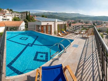 Теплый бассейн на крыше с видом на горы)