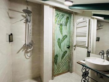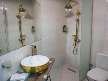Маленький сан узел, небольшая перегородка в душе, поэтому когда принимаешь душ, вода по всей ванной комнате растекалась, возможно помогла бы перегородка побольше..