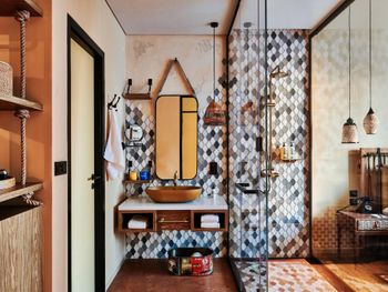 душ прямо посреди номера - интересное решение:)