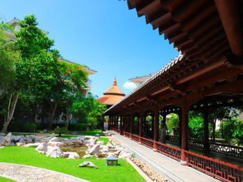 Понравилось расположение-5 минут до общественного пляжа. Море фантастическое. Пляжная полоса широкая и длинная. Один из выходов отеля прямо на оживленную торговую улицу, где можно всегда поесть, что-нибудь купить, прогуляться.. территория отеля интересная, в китайском стиле, довольно большой бассейн. Отель расположен в центре бухты, до парка "Тропический рай" 5 минут на такси.