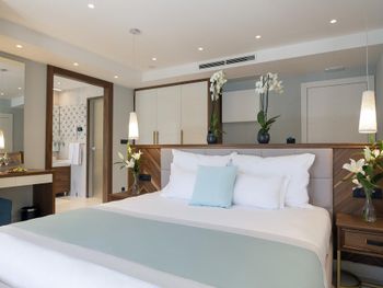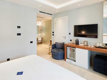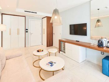 Прекрасное местоположение. Отдельный пляж, чистейшее море. Тихо, комфортно днем и весело в выходные (диджей на пляже). Удобные лежаки, полотенца, пуфы. Продумано бронирование, всегда помогали с наличием мест работники на пляже. Хорошее обслуживание на пляже: быстро, оплата любым способом, вкусные соки, смузи. Отличные, разнообразные завтраки, персонал на завтраках - очень быстро и качественно все накрывал и убирал. Очень удобно расположен: недалеко от старого города и в тоже время вдали от шума. Каждый день ездили на такси в старый город ужинать. (в одну сторону 2,5-5 евро).